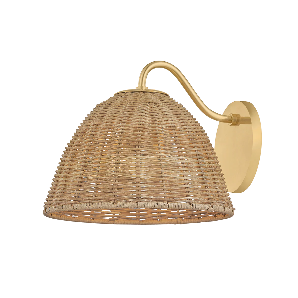 A timeless silhouette gets a fresh update with the Katniss Wall Sconce. Handwoven from vintage natural wicker, the mushroom-shaped shades nod to an organic, loosely botanical motif. The arms of the Aged Brass-Finished frame follow the curved of the shades for a decorative flourish. Katniss is the perfect way to add texture and whimsy to a space.