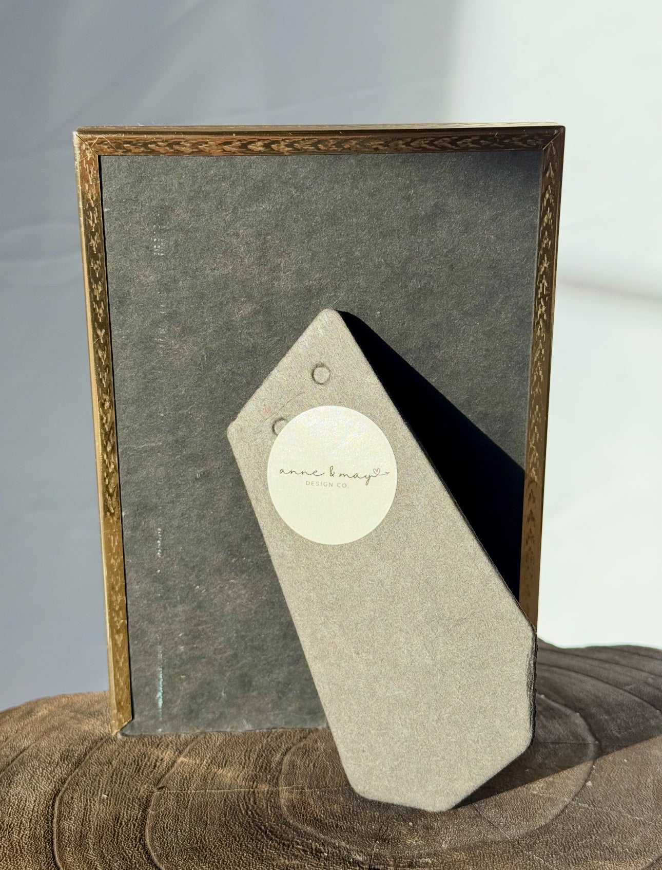 Each frame has been thrifted and repurposed, meaning no two are exactly alike. Light wear and patina add to its one-of-a-kind character, making every piece truly unique. Complete with an arm stand for effortless display on shelves, mantles, or side tables.